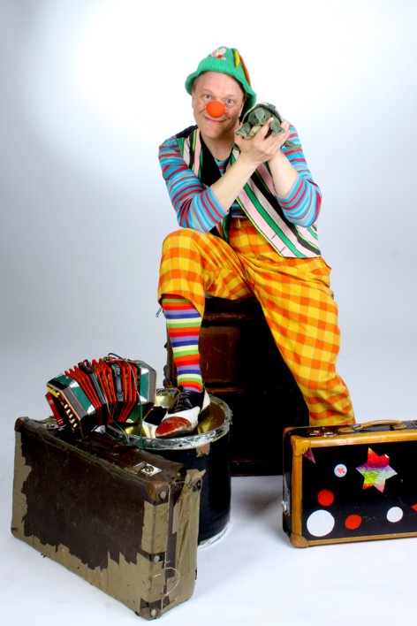Kinder zeigt Clown Valentino, wie er in typischer Clownsmanier von einer Situation